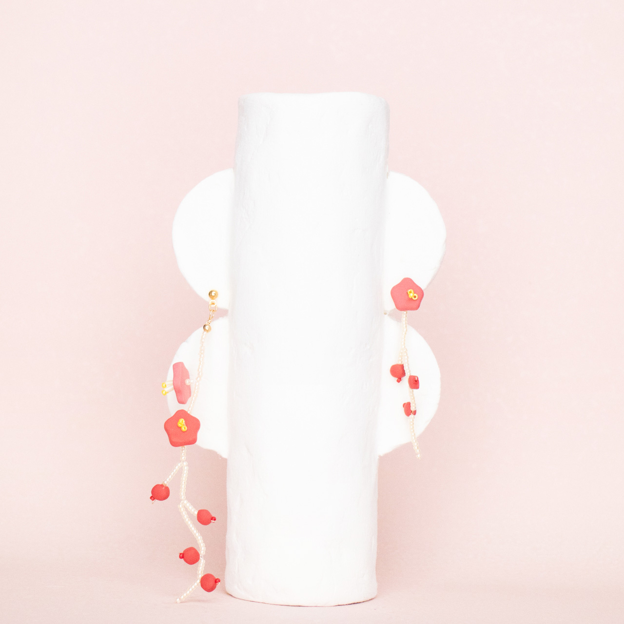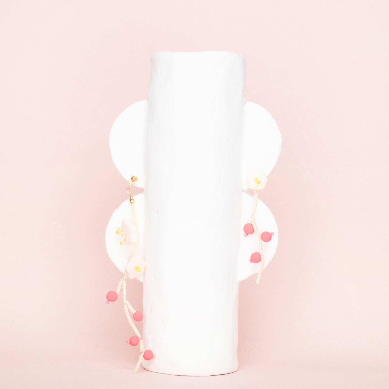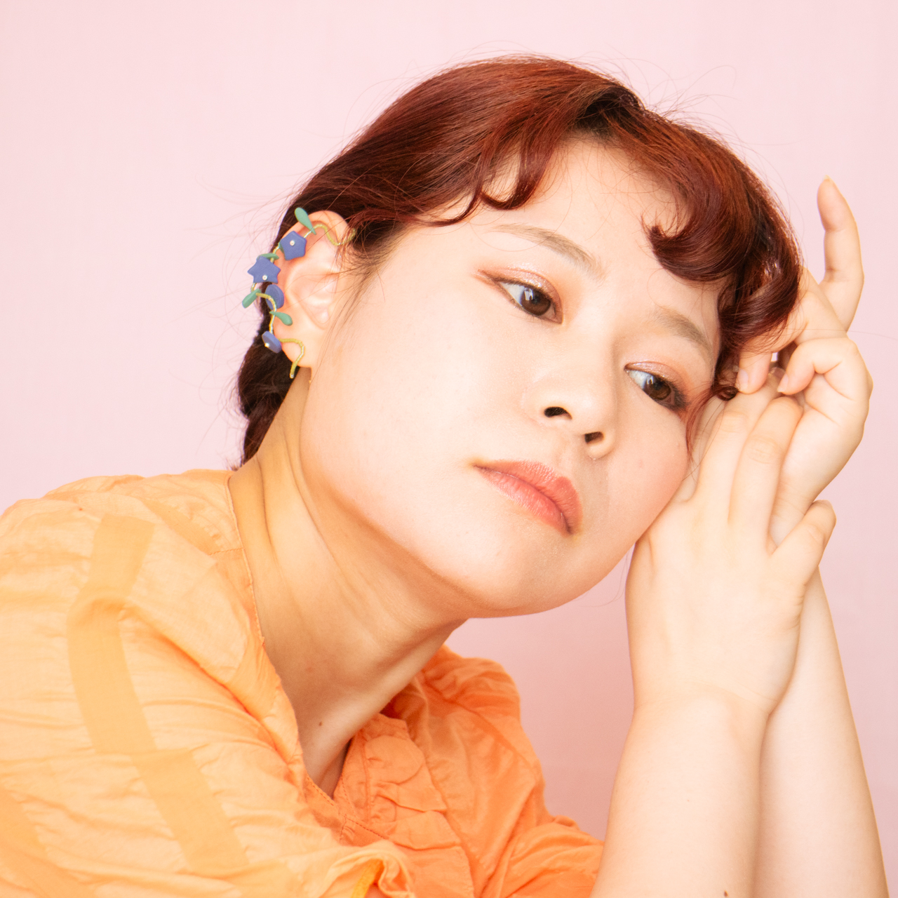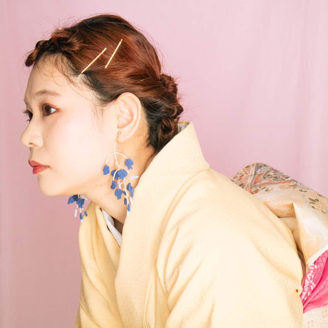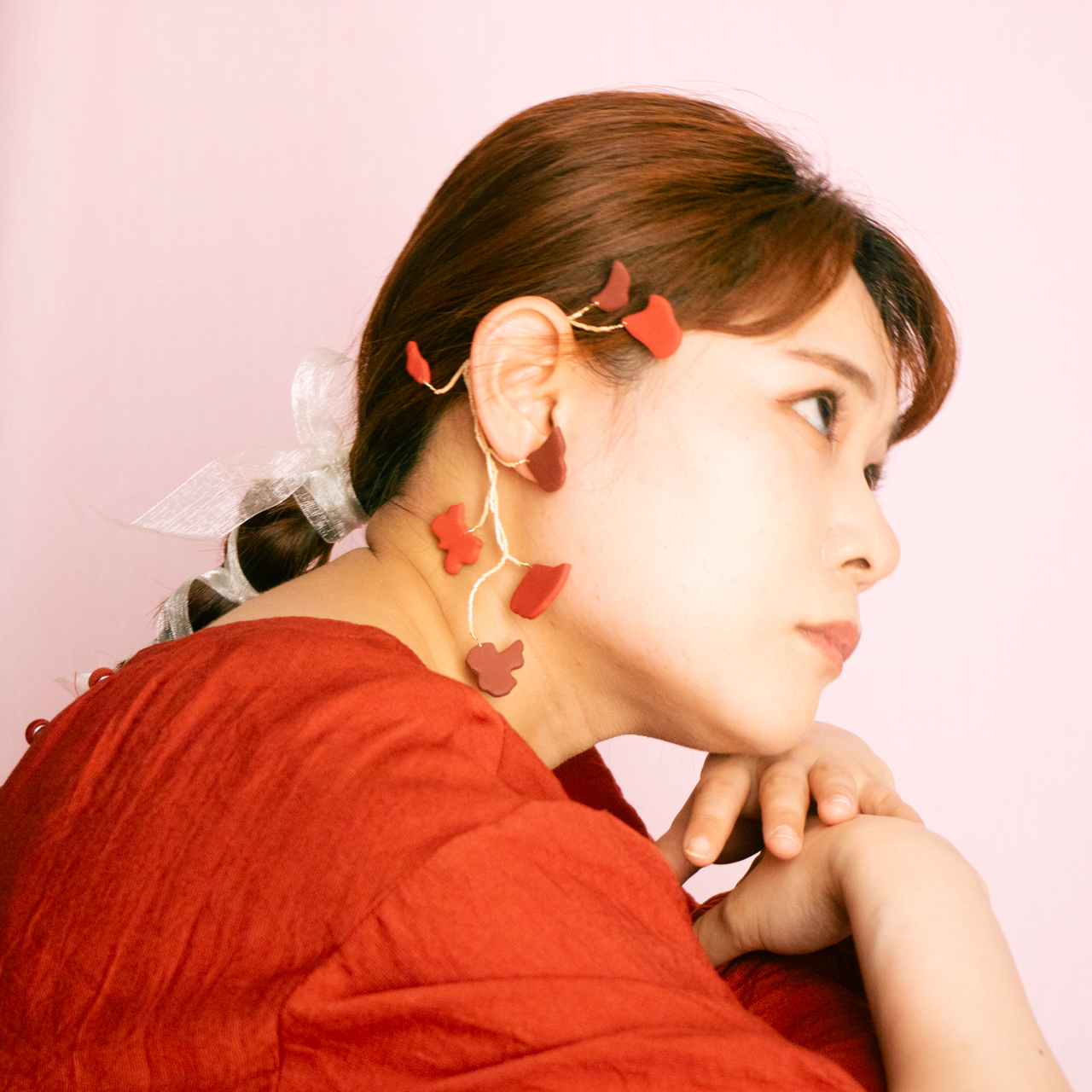 花を髪飾りに見立ててみたり、シロツメクサで花冠を作った頃をふわっと思い出すような、童心にかえることのできる大人のためのアクセサリーを目指しました。botanicではHi, thereの新しい試みとして、ワイヤーやビーズといった異素材を従来のクレイと組み合わせてみました。これまで9ピンやマルカンといった既製品を使用していた部分をワイヤーやビーズに変更したことで、より自由で遊び心たっぷりな作品に仕上がりました。