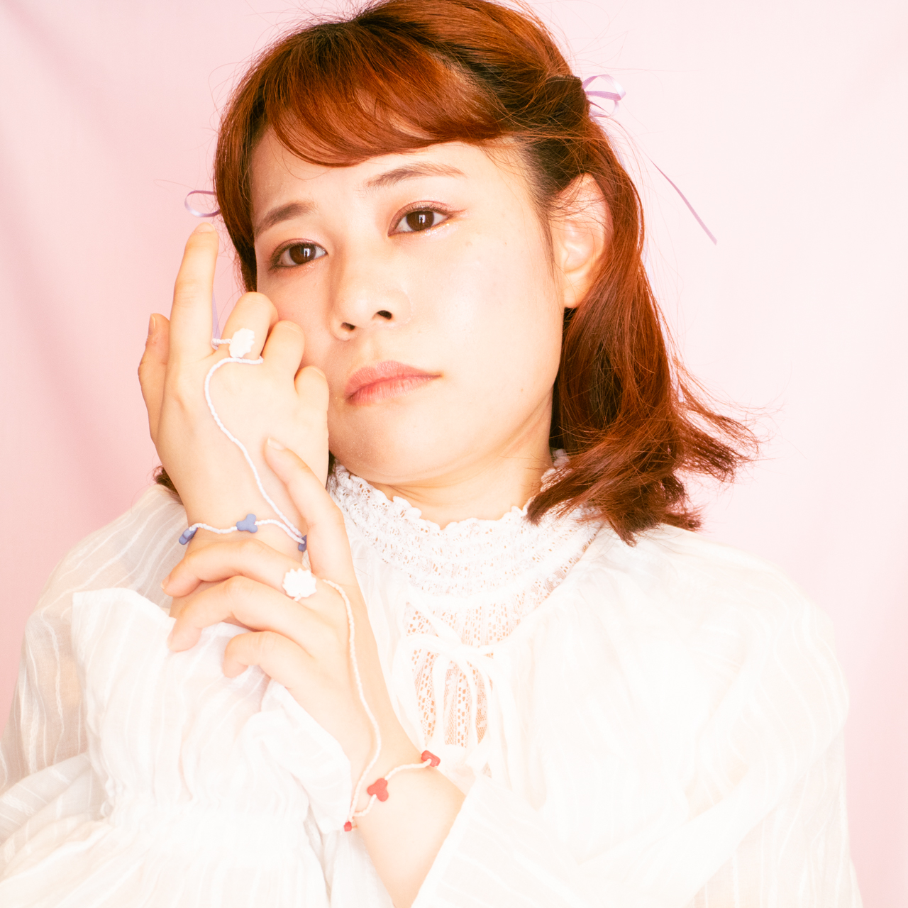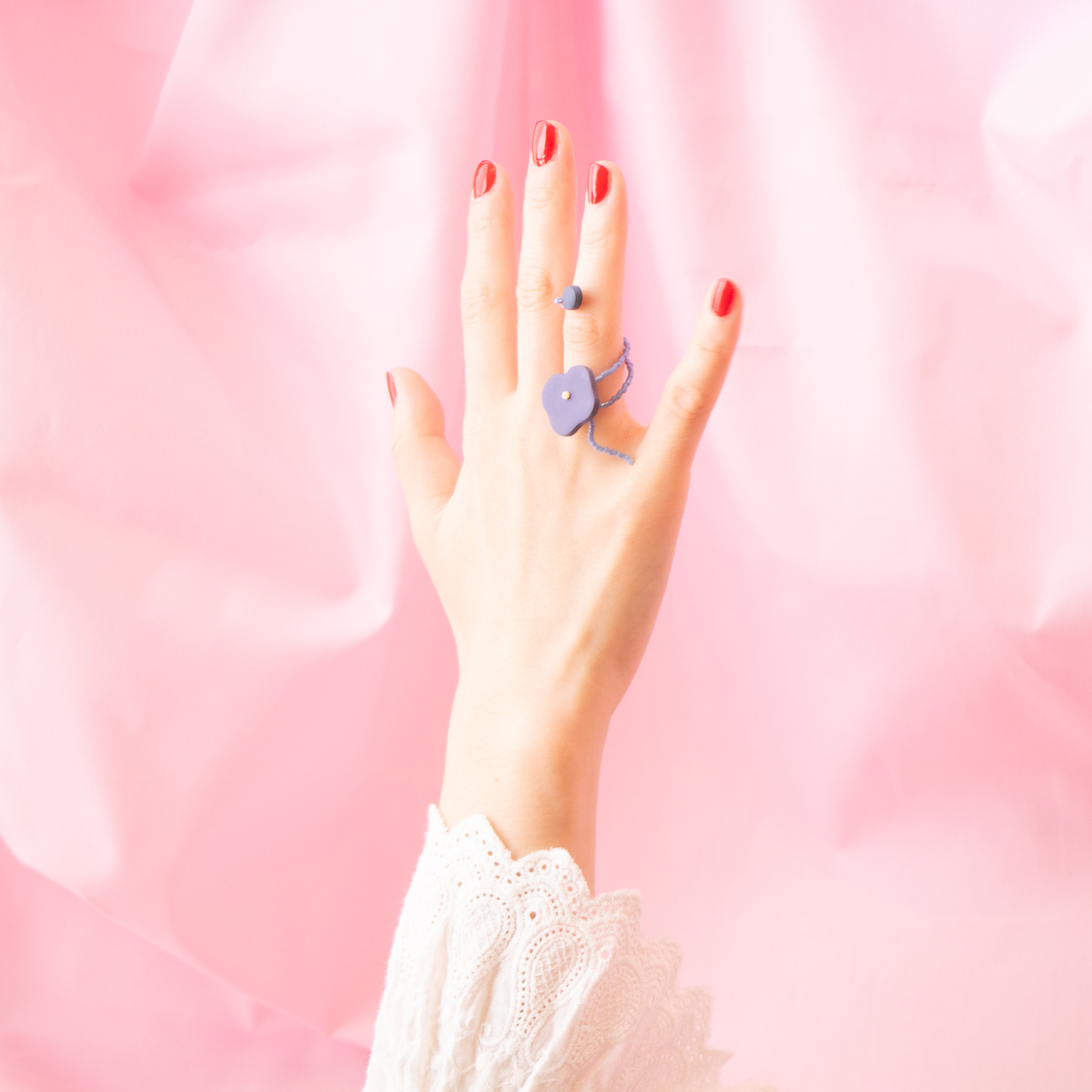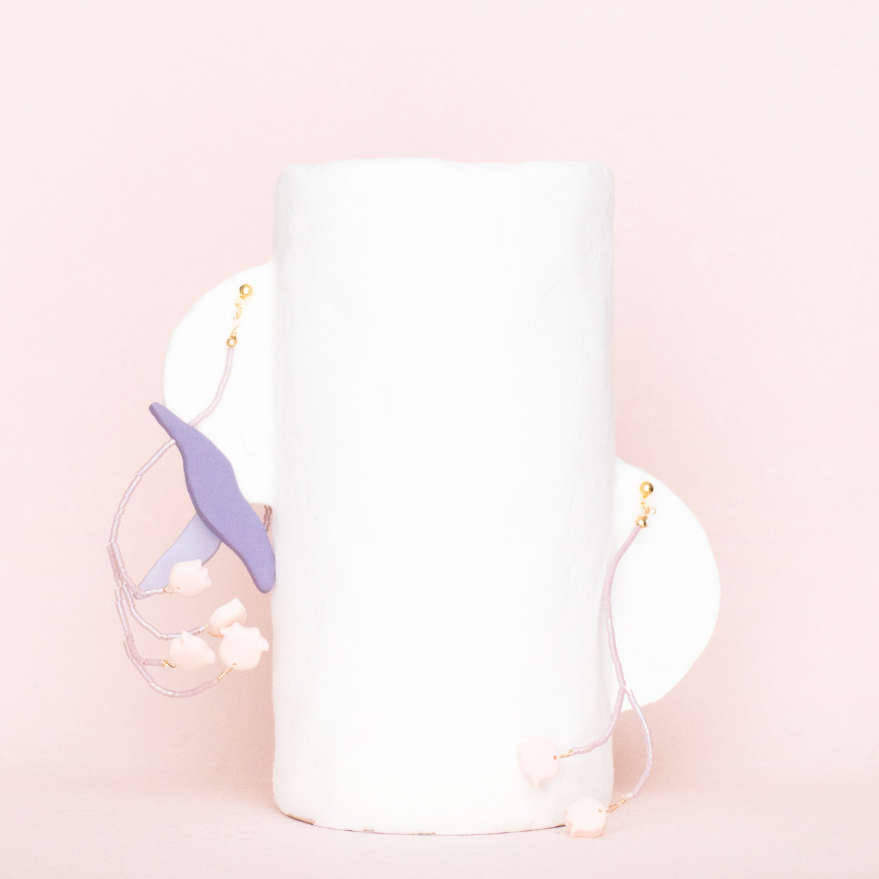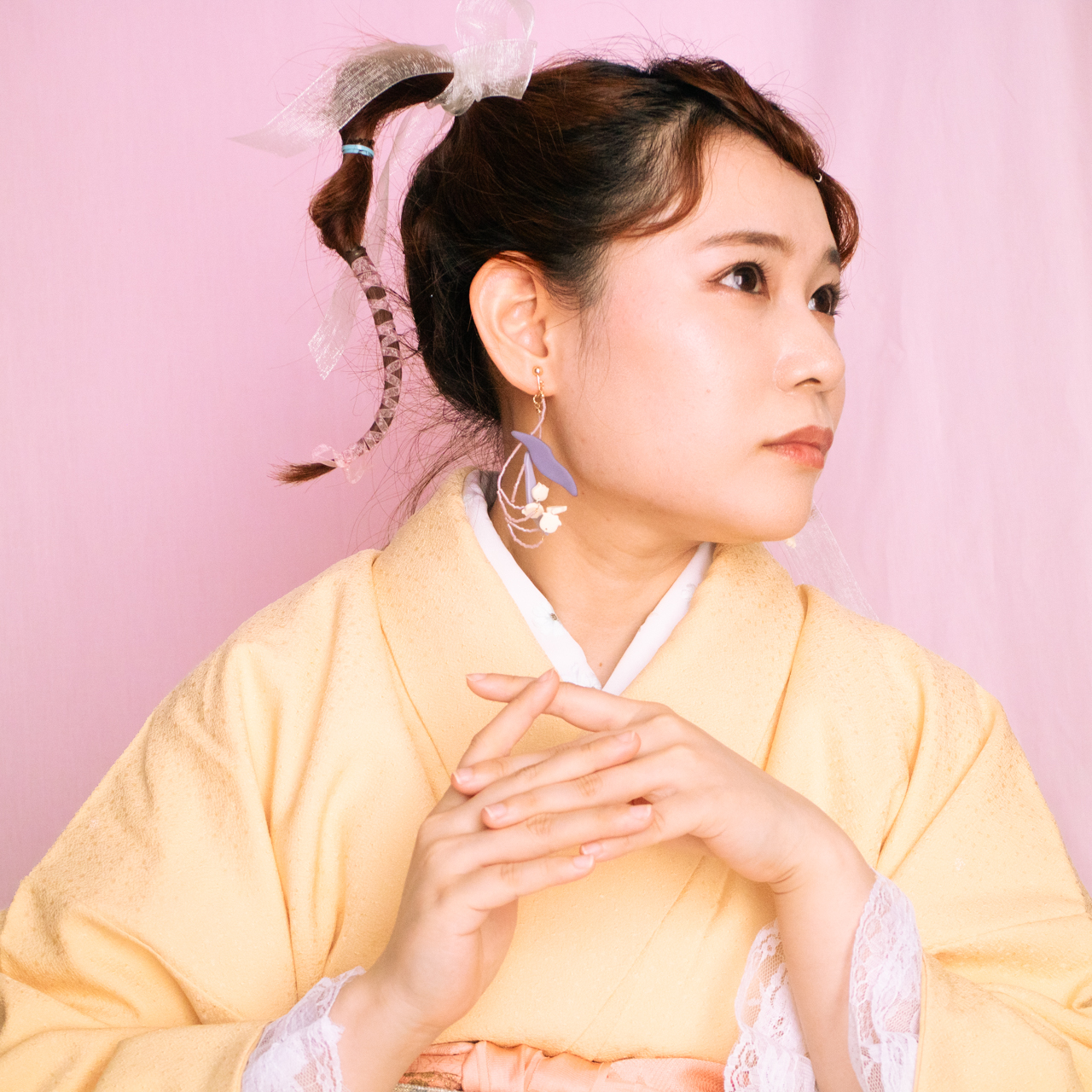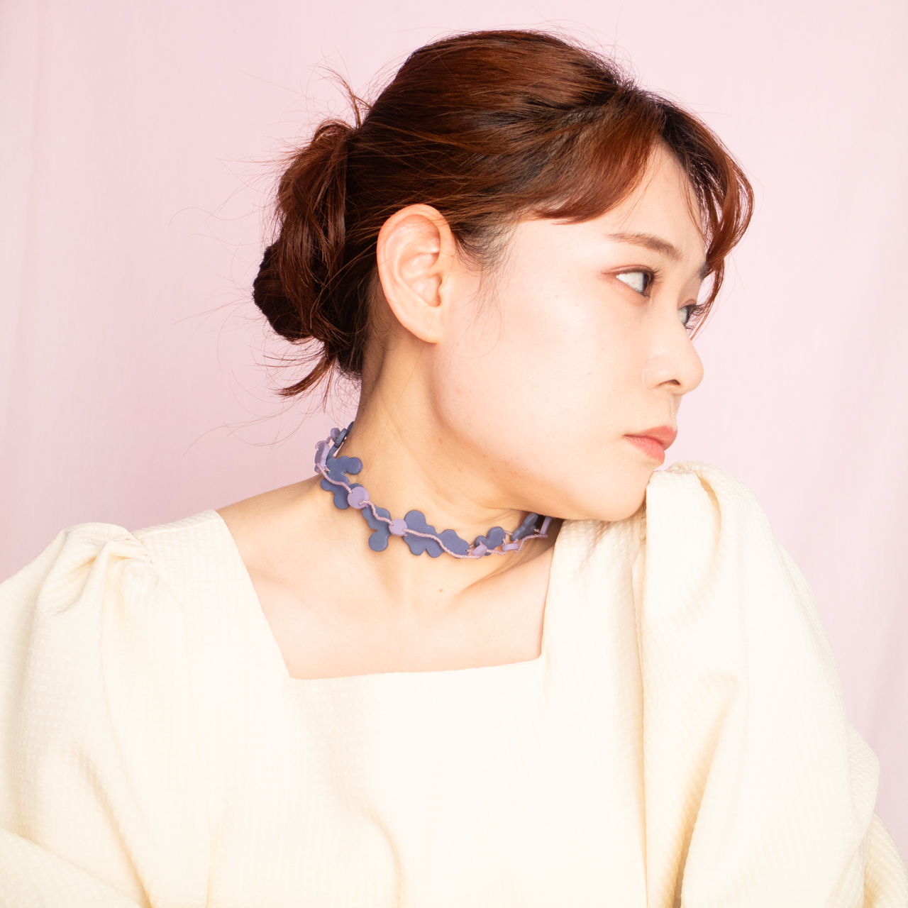 花を髪飾りに見立ててみたり、シロツメクサで花冠を作った頃をふわっと思い出すような、童心にかえることのできる大人のためのアクセサリーを目指しました。botanicではHi, thereの新しい試みとして、ワイヤーやビーズといった異素材を従来のクレイと組み合わせてみました。これまで9ピンやマルカンといった既製品を使用していた部分をワイヤーやビーズに変更したことで、より自由で遊び心たっぷりな作品に仕上がりました。