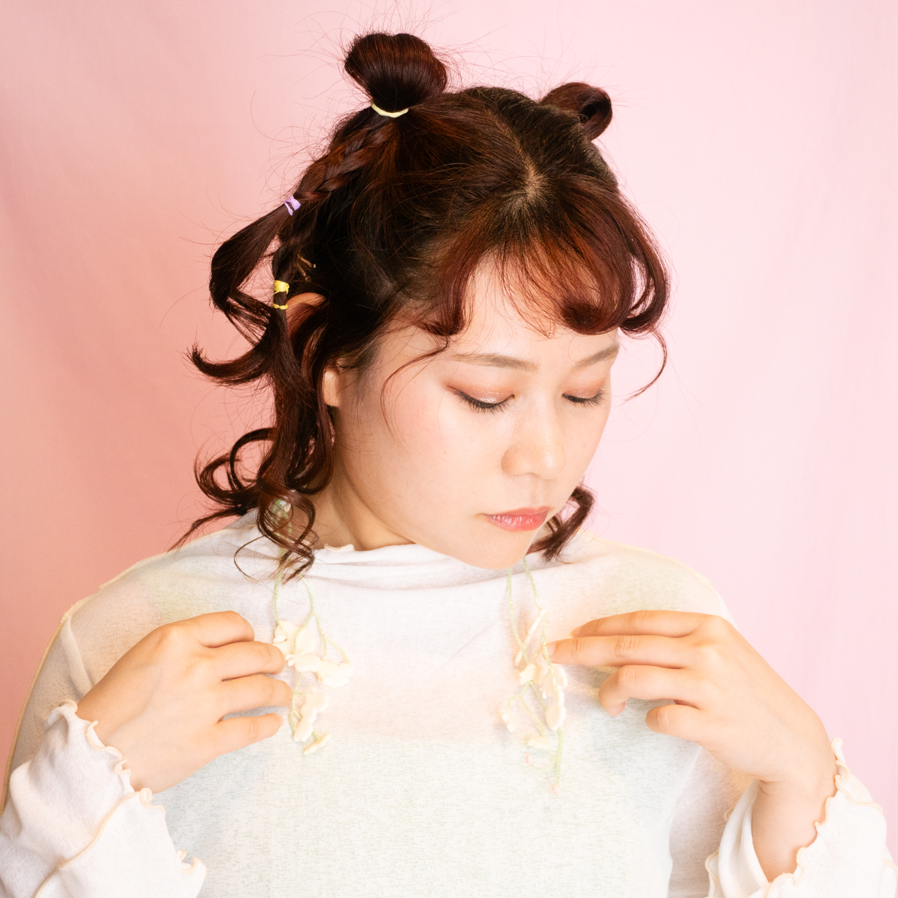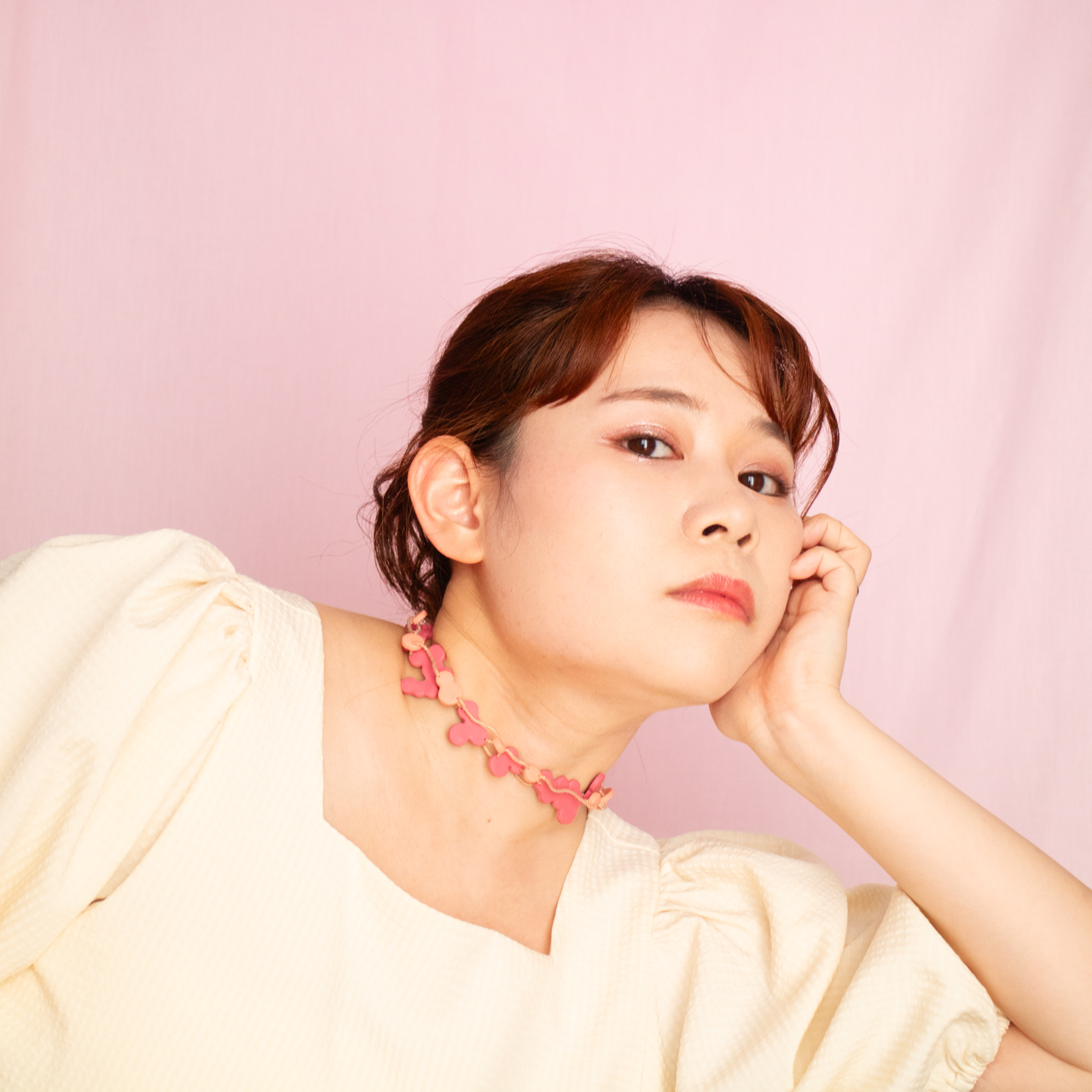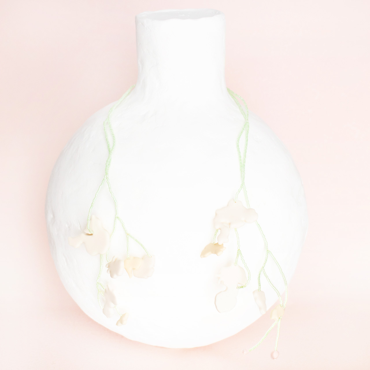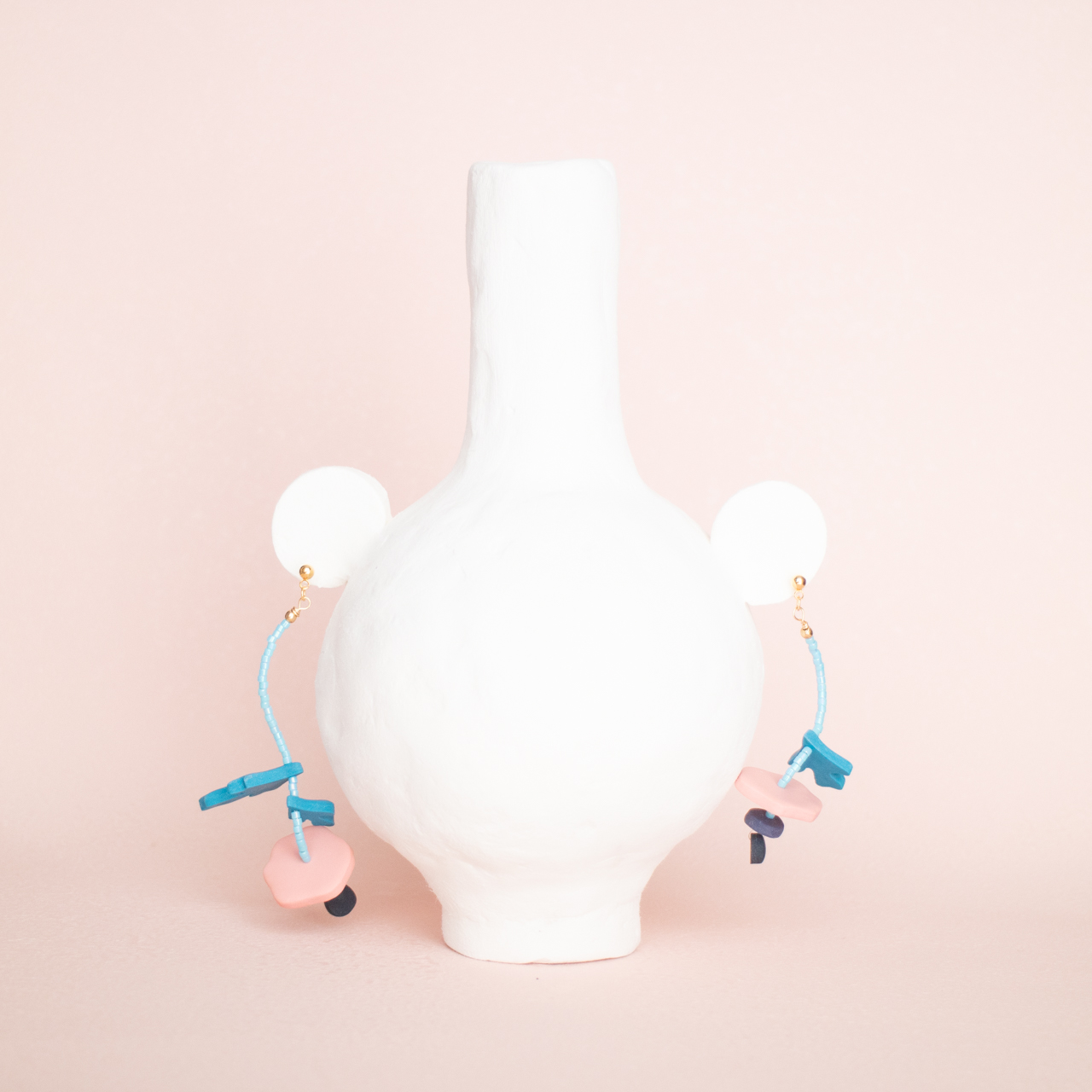 花を髪飾りに見立ててみたり、シロツメクサで花冠を作った頃をふわっと思い出すような、童心にかえることのできる大人のためのアクセサリーを目指しました。botanicではHi, thereの新しい試みとして、ワイヤーやビーズといった異素材を従来のクレイと組み合わせてみました。これまで9ピンやマルカンといった既製品を使用していた部分をワイヤーやビーズに変更したことで、より自由で遊び心たっぷりな作品に仕上がりました。