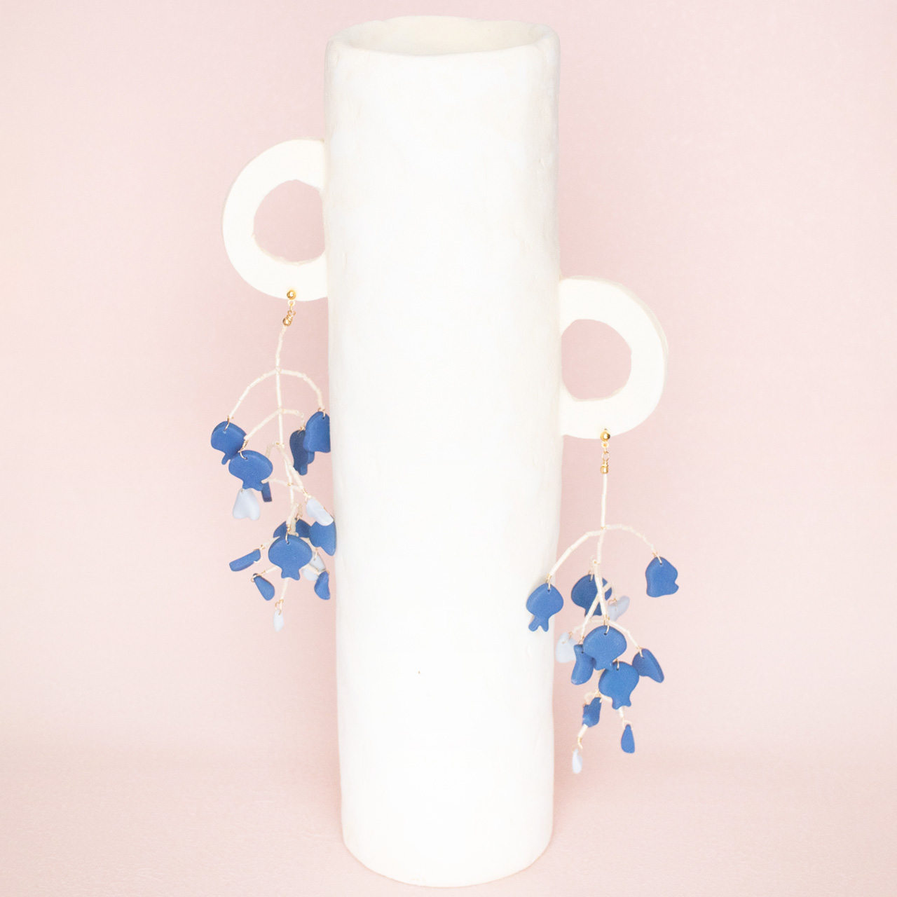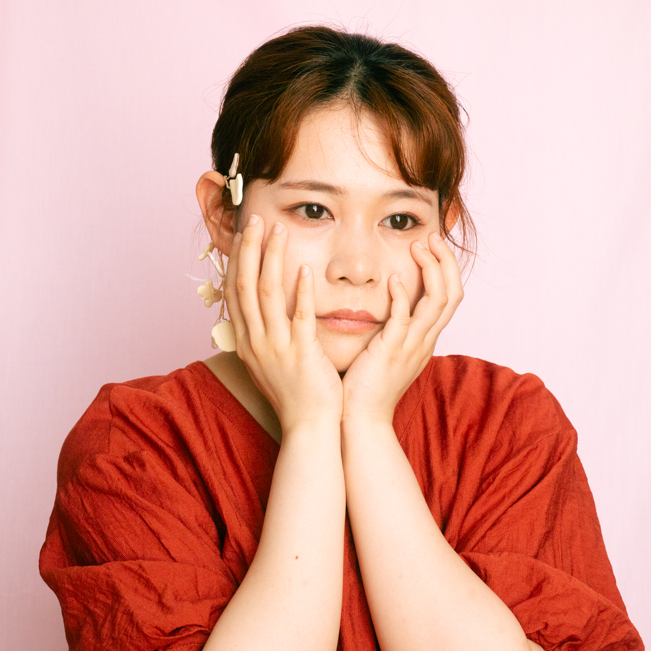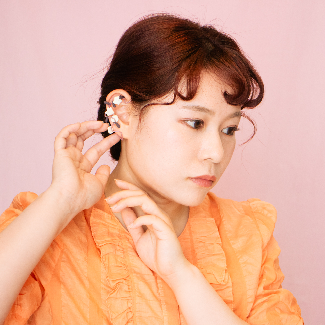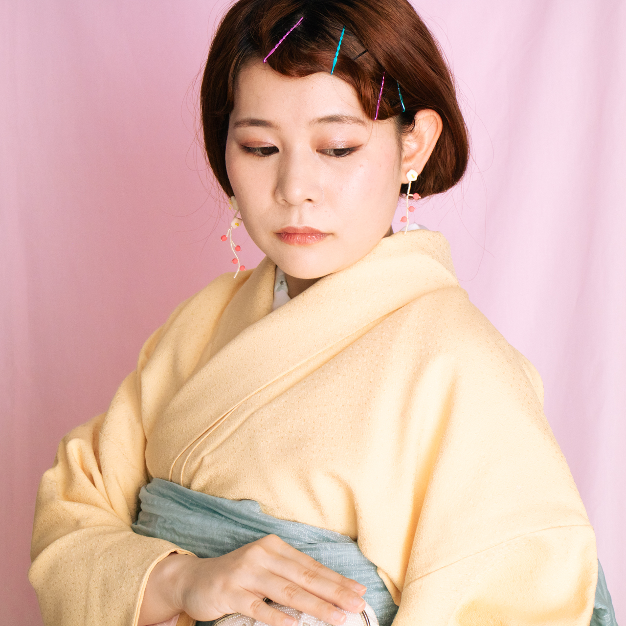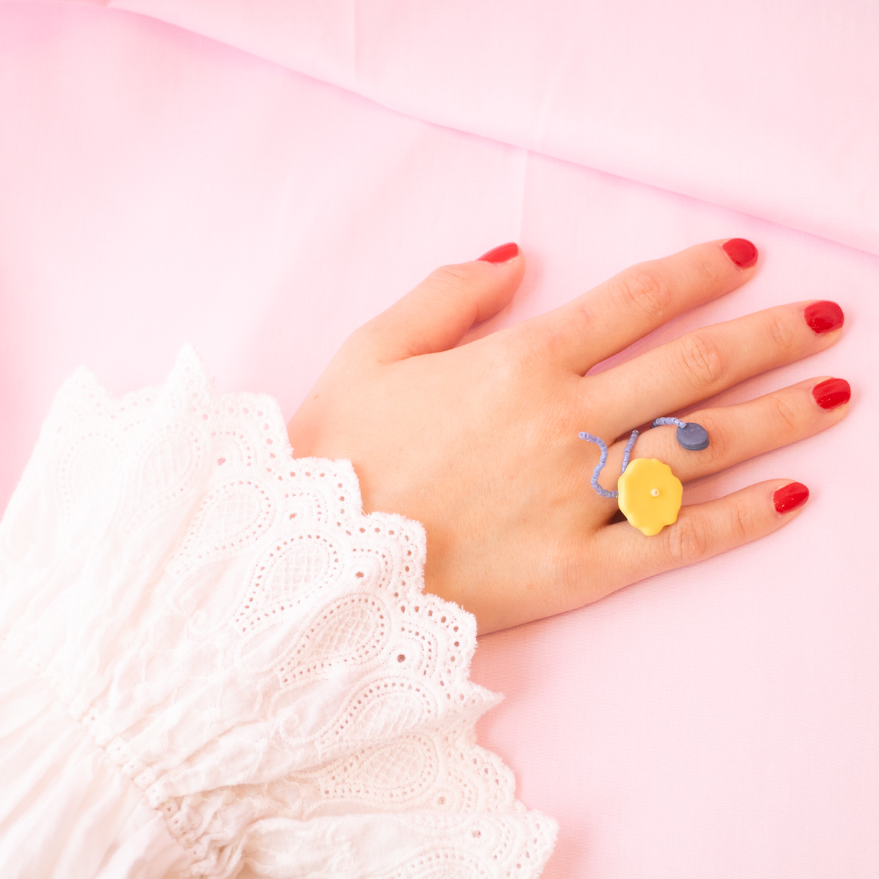 花を髪飾りに見立ててみたり、シロツメクサで花冠を作った頃をふわっと思い出すような、童心にかえることのできる大人のためのアクセサリーを目指しました。botanicではHi, thereの新しい試みとして、ワイヤーやビーズといった異素材を従来のクレイと組み合わせてみました。これまで9ピンやマルカンといった既製品を使用していた部分をワイヤーやビーズに変更したことで、より自由で遊び心たっぷりな作品に仕上がりました。